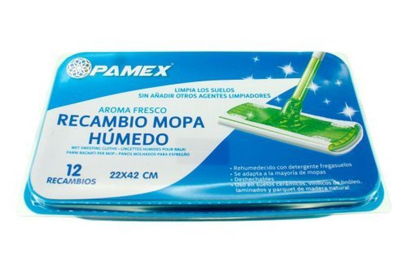 Recambios para mopa húmeda PAMEX, pack de 12 unidades de 22x42 cm. Con aroma fresco y detergente integrado, limpia sin arañar superficies como baldosas, laminados y madera natural. Ideal para mantener el hogar limpio y con olor agradable. Compatible con la mayoría de mopas.