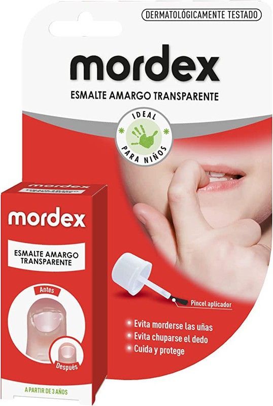 Mordex Esmalte Amargo Transparente, ideal para niños a partir de 3 años. Dermatológicamente testado, ayuda a evitar el morderse las uñas y chuparse el dedo. Aplicación sencilla con pincel incluido. Protege y cuida las uñas de forma segura y efectiva. Embalaje práctico y visualmente claro.