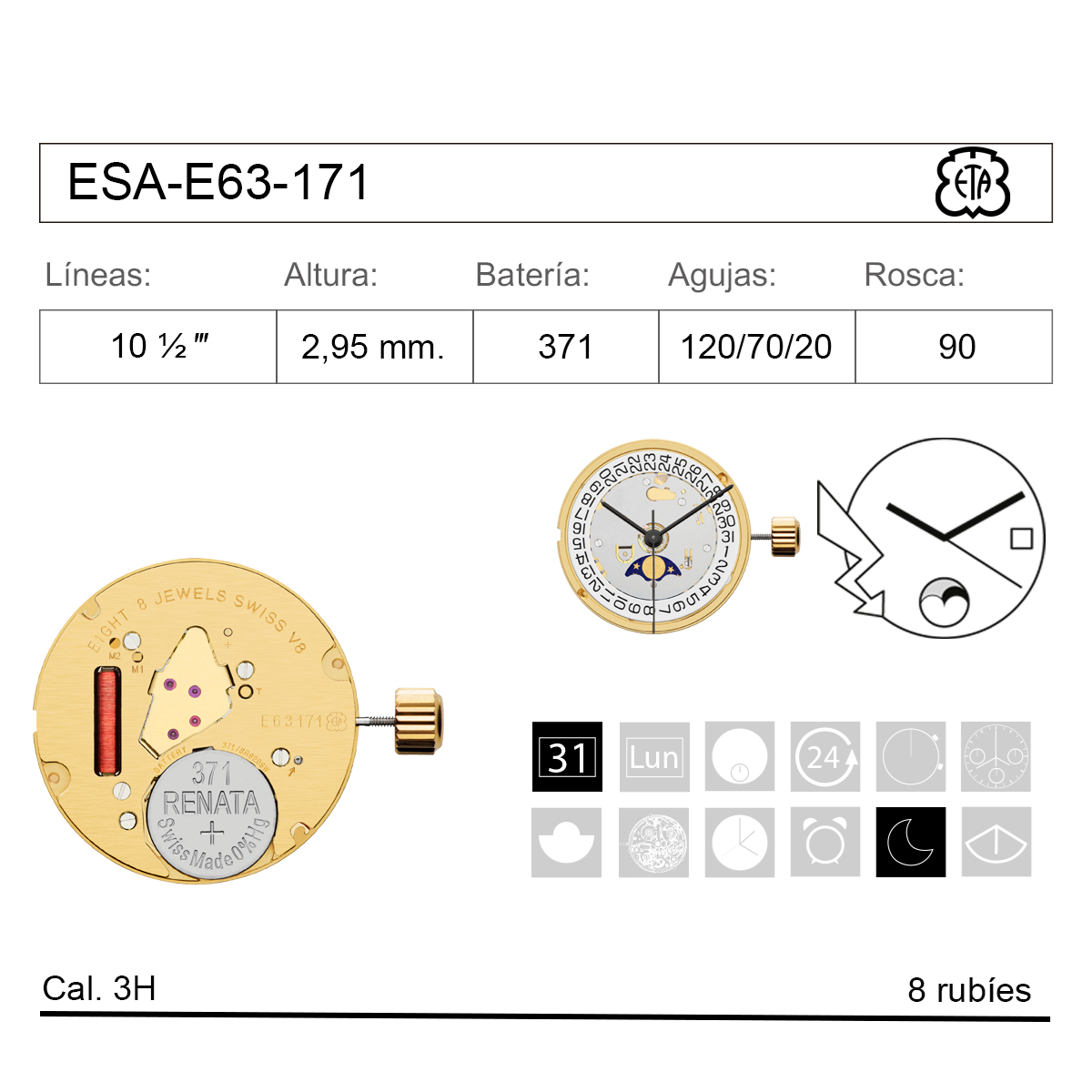Movimiento de reloj cuarzo ETA ESA-E63-171 con calendario y fase lunar, ideal para relojeros y entusiastas de la relojería. Calibre 3H con 8 rubíes, altura de 2,95 mm y batería 371. Incluye indicadores de fecha, día, 24 horas y fase lunar. Fabricado con precisión suiza, perfecto para montajes en relojes de pulsera o de colección.