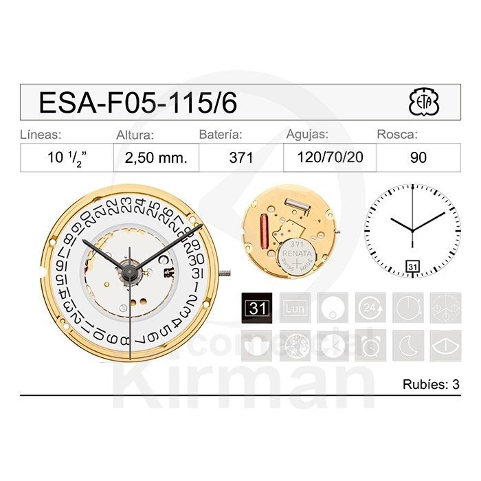 | Nombre | Movimiento Reloj Cuarzo ETA ESA-F05-115/6 Calendario 6H |