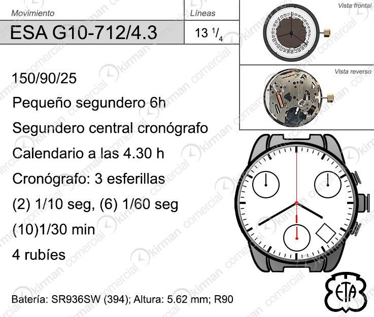 | Nombre | Movimiento Reloj Cuarzo ETA ESA-G10-712/4.3 Calendario 4.3H |