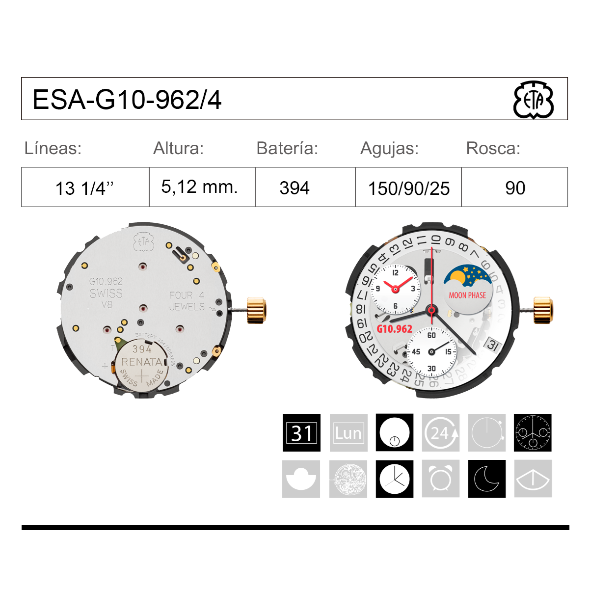 | Nombre | Movimiento Reloj Cuarzo ETA ESA-G10-962/4 Fase Lunar Calendario 4H |