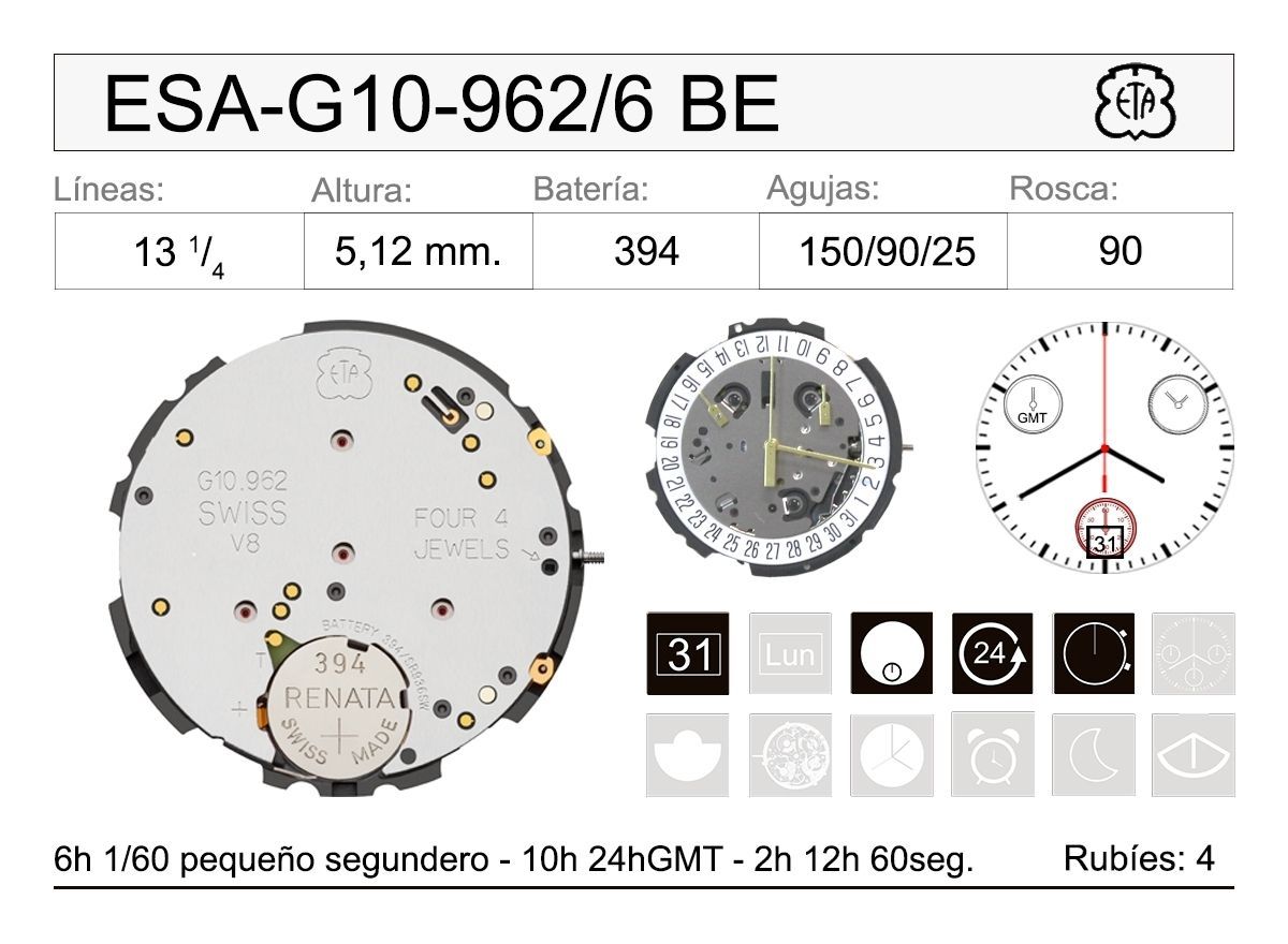 | Nombre | Movimiento Reloj Cuarzo ETA ESA-G10-962/6 GMT Calendario 6H |