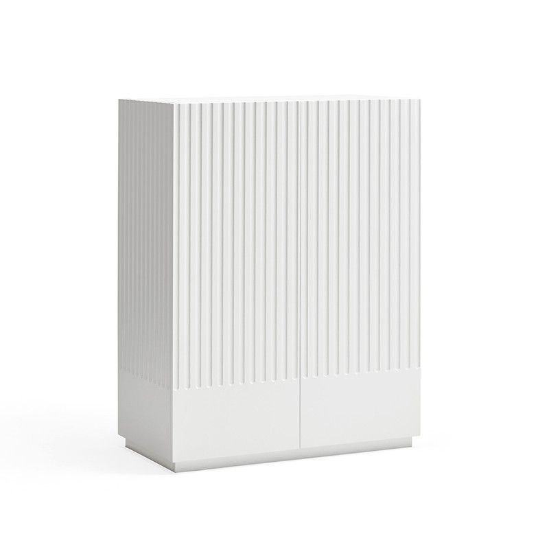 Mueble auxiliar Doric en blanco, ideal para comedor o salón. Con dimensiones de 92 x 46 x 120 cm, combina elegancia y funcionalidad. Fabricado en madera, presenta un diseño moderno con líneas verticales en la parte superior y puertas lisas en la inferior. Perfecto para almacenar objetos decorativos o utensilios de cocina con estilo.