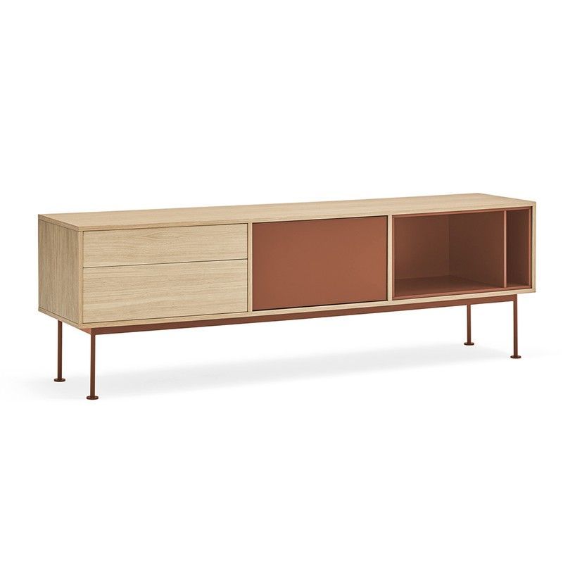 Mueble TV Yoko de diseño moderno, fabricado en madera de roble y detalles en color teja. Con patas metálicas finas y tres compartimentos funcionales: dos cajones, un cajón con puerta y un espacio abierto. Ideal para salas de estar contemporáneas, combina estilo y funcionalidad. Dimensiones: 180 x 40 x 58 cm.