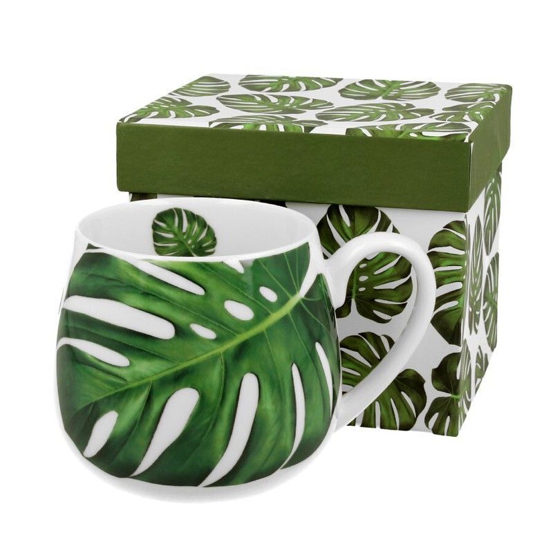 Taza de porcelana de 43 cl con diseño tropical de hoja de monstera en verde y blanco. Ideal para café, té o infusiones. Su estética natural y elegante la convierte en un accesorio decorativo perfecto para tu cocina o mesa. Fabricada en porcelana de alta calidad, resistente y fácil de limpiar. Incluye caja de regalo con diseño coordinado.