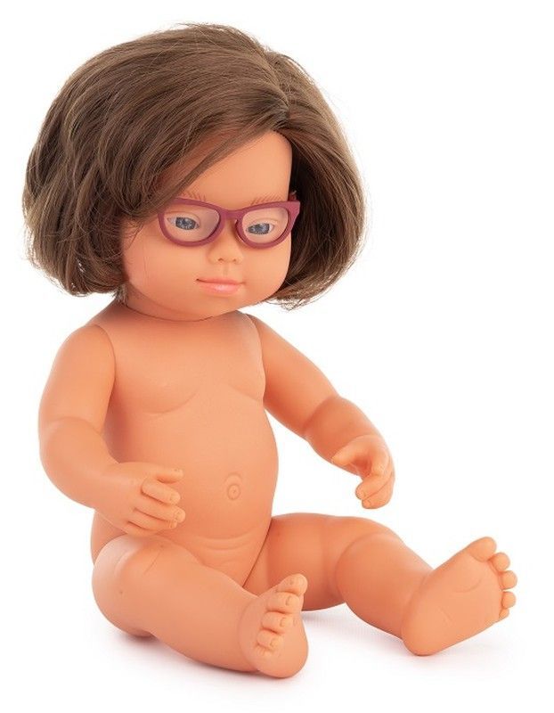 Muñeca niña caucásica con gafas de 38 cm, piel desnuda y cabello corto, perfecta para niños pequeños.