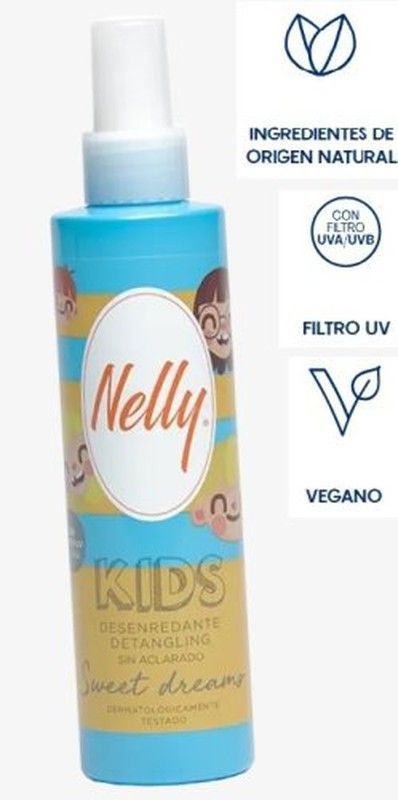 Desenredante para niños Nelly Kids, con fórmula sin aclarado y aroma Sweet dreams. Ideal para cabellos difíciles, con ingredientes de origen natural, filtro UV UVA/UVB y certificado vegano. Dermatológicamente testado, suave y seguro para el cabello infantil. Fácil de usar con spray práctico.