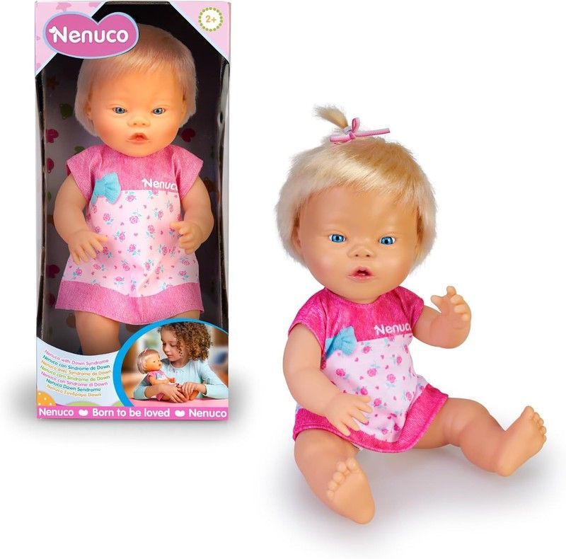 Muñeca Nenuco con síndrome de Down, ideal para niños a partir de 2 años. Con piel realista, cabello rubio y ojos azules, viste un body rosa con estampado floral. Fomenta la inclusión y el juego imaginativo. Hecha con materiales seguros y de calidad, perfecta para desarrollar empatía y amor por la diversidad.