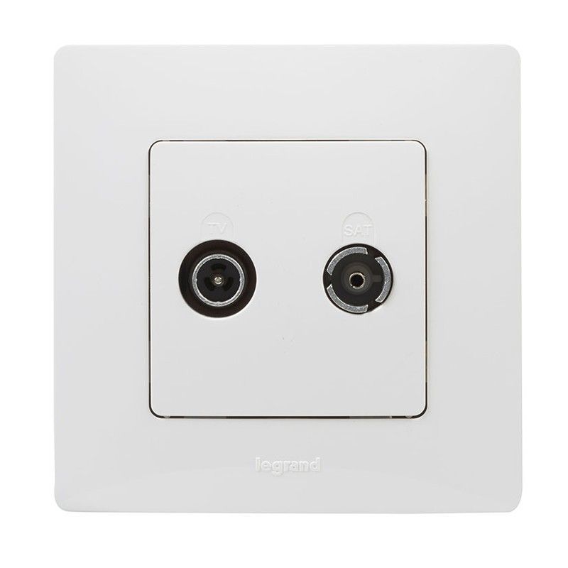 Toma de TV y Satélite Niloe en blanco, diseño monobloc y acabado elegante. Ideal para instalaciones de audio y video en hogar o oficina. Fabricada en plástico y metal de alta calidad, con conectores coaxiales para una conexión segura y estable. Perfecta para integrar en paredes con estilo discreto y funcional.