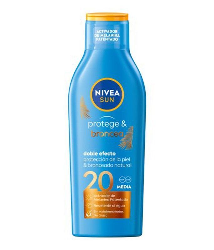 Nivea Sun Leche Protege & Broncea SPF 20: protección solar con efecto bronceador natural. Ideal para quienes buscan cuidar su piel y obtener un tono dorado saludable. Con activador de melanina patentado, resistente al agua y sin sustancias irritantes. Perfecta para uso diario en la playa o piscina. Protección media para una piel más segura bajo el