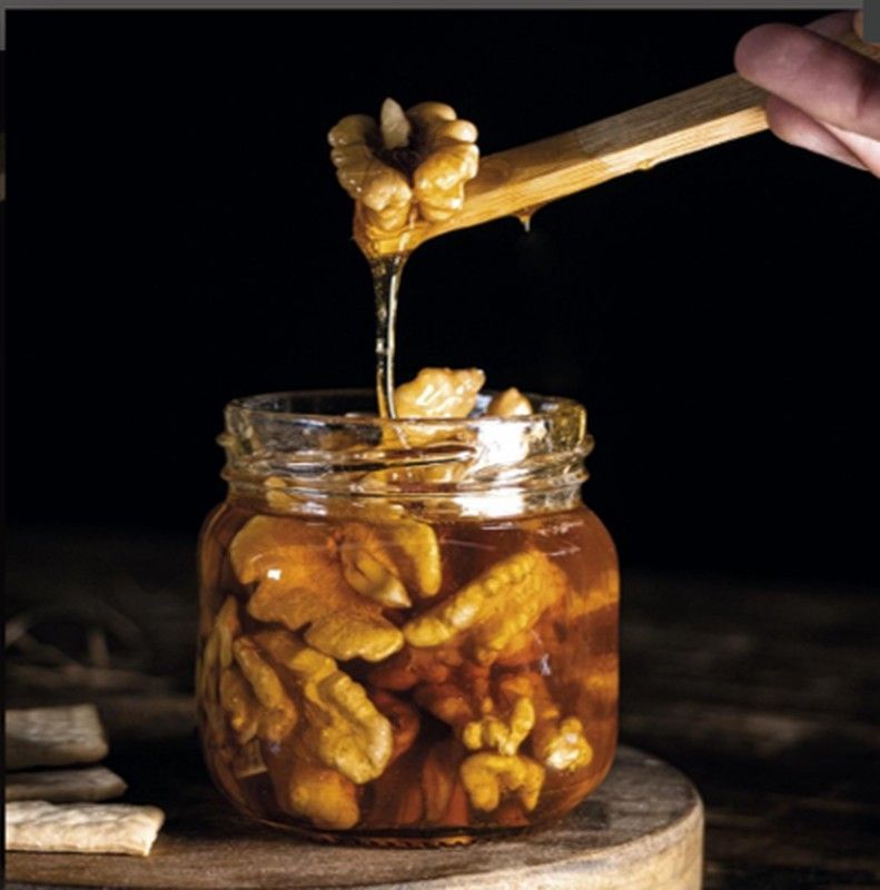 Nueces con miel Tierra Astur, 250 grs. Un exquisito producto artesanal ideal para disfrutar como snack saludable o regalo gourmet. Las nueces enteras se impregnan en miel de alta calidad, ofreciendo un sabor dulce y tostado perfecto para acompañar quesos, panes o disfrutar solo. Presentado en frasco de vidrio transparente que resalta su apariencia