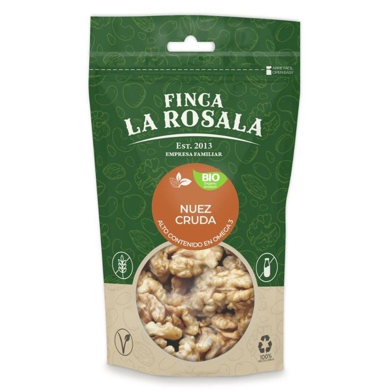 Nueces crudas ecológicas de Finca La Rosala, en bolsa de 150 grs. Alto contenido en omega-3, ideales para una alimentación saludable y equilibrada. Producto natural, sin aditivos, perfecto para snacks, batidos o recetas gourmet. Envase con ventana transparente que muestra el contenido real. Ideal para amantes de frutos secos y alimentación conscien