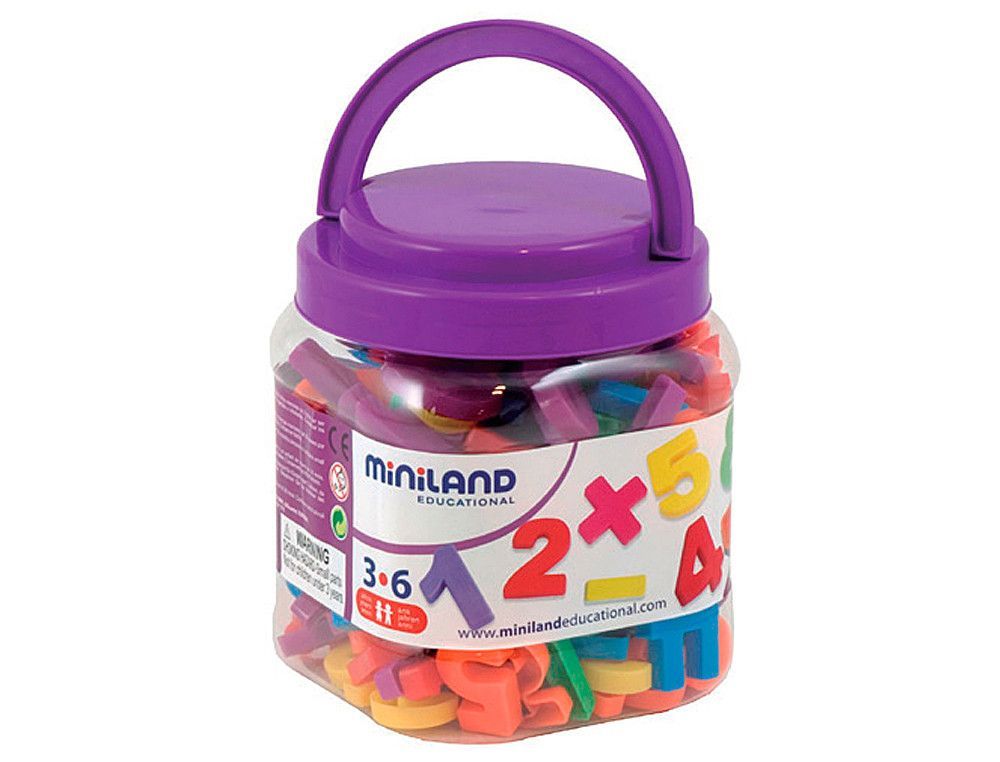 Números magnéticos Miniland para niños de 3 a 6 años. Ideal para aprender matemáticas de forma divertida y manipulativa. Contenido en bote transparente con tapa morada, fácil de transportar. Perfecto para actividades educativas en casa o en clase. Fomenta el aprendizaje temprano de números y operaciones básicas.