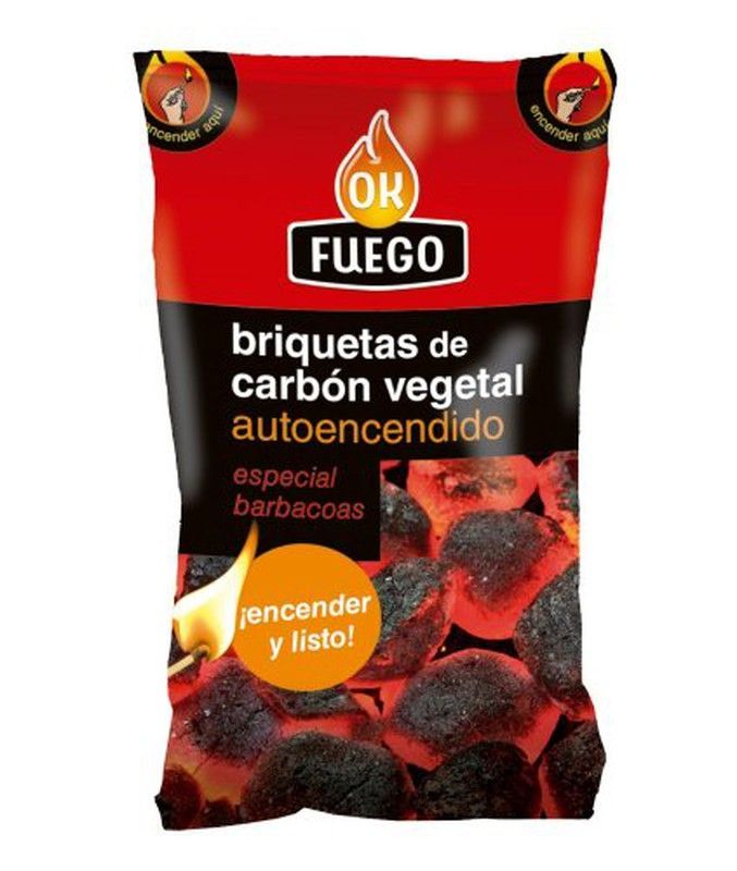 Briquetas de carbón vegetal autoencendido OK FUEGO, ideales para barbacoas. Enciende y listo: sin necesidad de cerillas ni aceleradores. Envase práctico con diseño llamativo en rojo y negro. Perfectas para disfrutar de momentos al aire libre con familia y amigos.