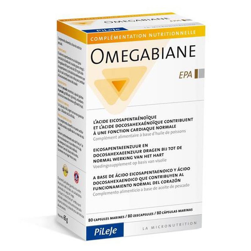 Omegabiane NUA, suplemento nutricional con ácido eicosapentaenoico y docosahexaenoico para el funcionamiento normal del corazón. En caja de 80 cápsulas marinas, ideal para adultos que buscan apoyo cardiovascular. Formulado por Pileje, líder en micronutrición. Sin materiales visibles del producto real, ya que se trata del embalaje.