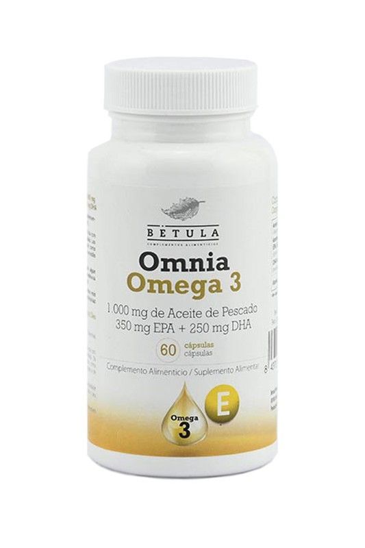 Omnia Omega 3 de Betula, suplemento alimenticio en 60 cápsulas con 1.000 mg de aceite de pescado por dosis, incluyendo 350 mg de EPA y 250 mg de DHA. Ideal para apoyar la salud cardiovascular y cerebral. Fórmula enriquecida con vitamina E. Perfecto para adultos que buscan mantener un equilibrio nutricional óptimo. Envase práctico y fácil de usar.