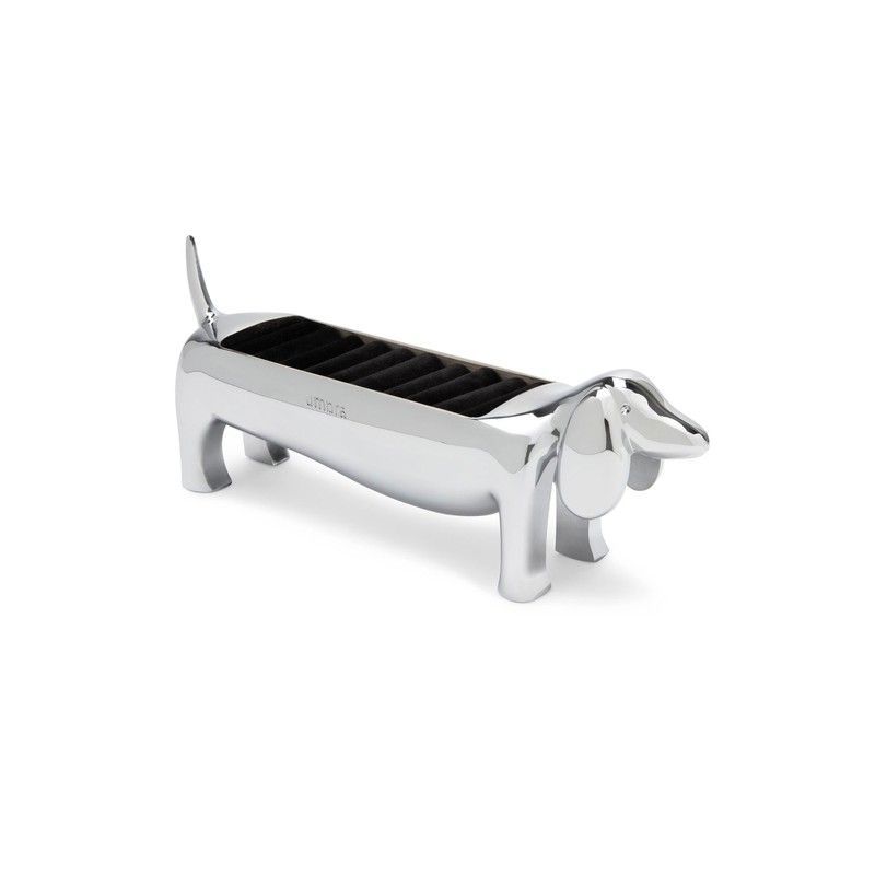 Organizador de anillos en forma de perro salchicha con acabado cromado brillante, ideal para decorar tu tocador o mesita de noche. Fabricado en acero inoxidable de alta calidad, cuenta con ranuras internas negras para mantener tus anillos ordenados y a la vista. Un accesorio funcional y divertido que combina estilo y utilidad para amantes de los pe