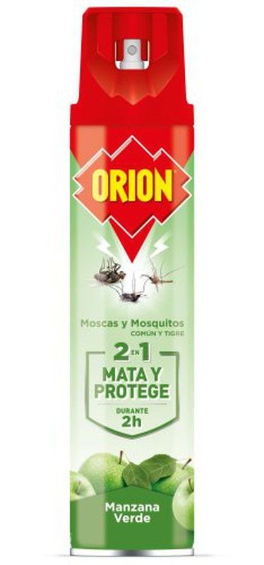 Orion Insecticida Spray Manzana Verde, ideal para eliminar moscas y mosquitos comunes y tigre. Con fórmula 2 en 1 que mata y protege durante 2 horas. Aroma agradable a manzana verde. Spray práctico y eficaz para uso en casa y jardín. Ideal para mantener espacios libres de plagas sin olores fuertes.