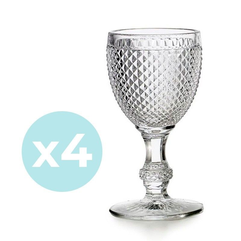 Pack de 4 copas de vino blanco Bicos, elaboradas en vidrio transparente con elegante diseño tallado en rombos. Perfectas para servir vinos blancos con estilo, estas copas combinan funcionalidad y diseño clásico. Ideal para ocasiones especiales o uso diario en tu mesa. Medidas: Ø6,8x12,7 cm.