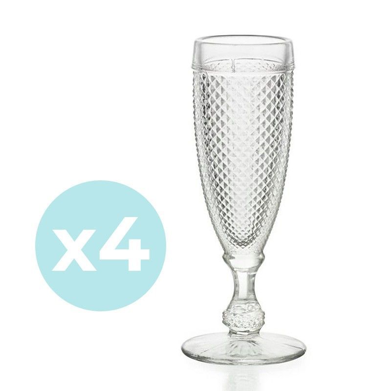 Pack de 4 copas flauta Bicos de vidrio transparente, con elegante diseño de rombos tallados. Ideales para servir champán, cócteles o bebidas frías. Su forma estilizada y acabado brillante las convierten en un complemento sofisticado para cualquier mesa. Perfectas para ocasiones especiales o uso diario en casa.