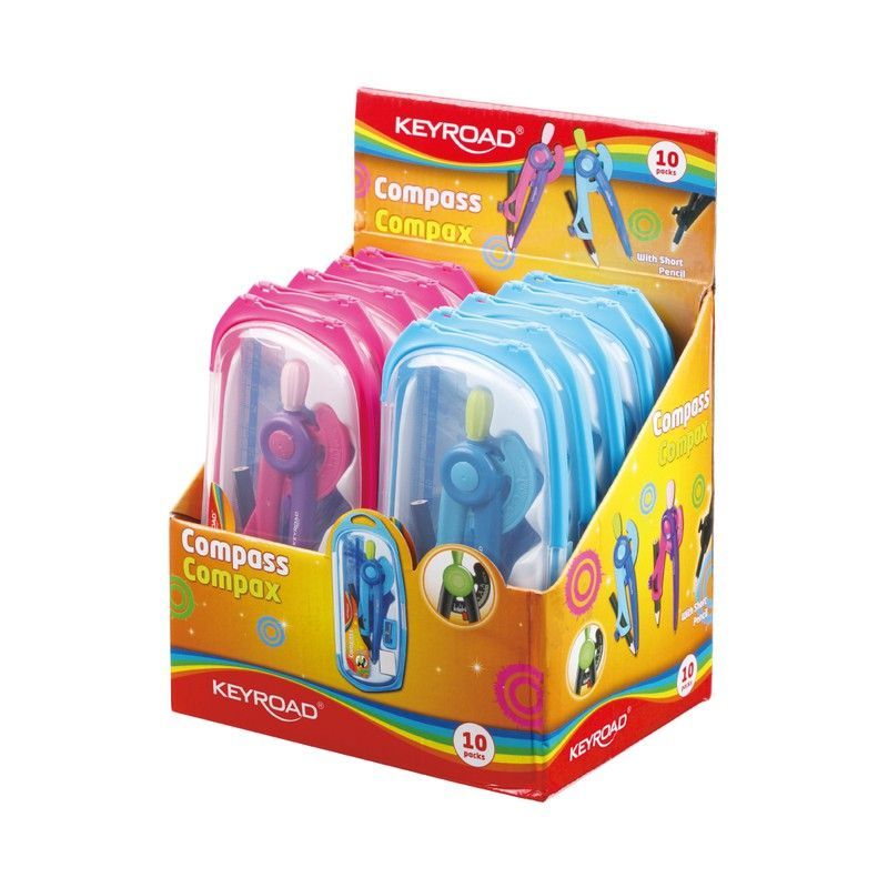 Pack Keyroad con compás, regla, sacapuntas y lápiz, ideal para niños en edad escolar. Presentado en caja rectangular con ventana transparente, contiene 10 unidades por pack en colores rosa y azul. Perfecto para clases de dibujo, geometría y manualidades. Diseño atractivo con ilustraciones infantiles y detalles en verde. Ideal para uso escolar y act