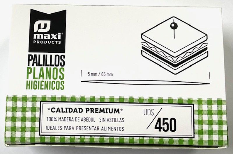 Palillos planos higiénicos de madera de abedul, calidad premium y sin astillas, ideales para presentar alimentos con estilo. Caja de 450 unidades, perfectos para eventos, catering y manualidades. Diseño limpio y profesional con detalles en verde y blanco.