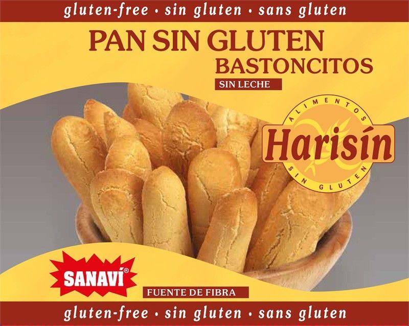 Panecillos sin gluten Harisín, ideales para personas con sensibilidad al gluten. Presentados en un envase atractivo con imagen de panecillos dorados y crujientes. Fuente de fibra y sin leche, perfectos para desayunos saludables o meriendas. Producto de la marca SANAVI, con calidad garantizada y sabor tradicional.