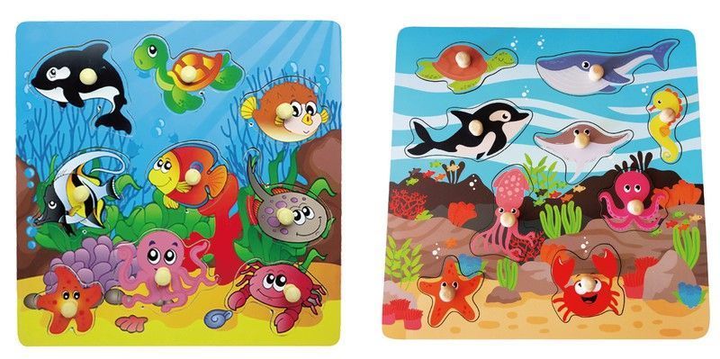 Panel de madera con animales marinos encajables para niños pequeños, ideal para aprender mientras juegan.