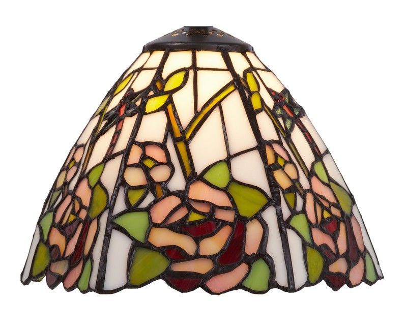 Pantalla de lámpara Tiffany blanca con diseño floral en tonos rosa, verde y amarillo. Ideal para lámparas fijas en salones, dormitorios o comedores. Fabricada con vidrio tallado y marco metálico, ofrece un estilo clásico y elegante. Diámetro de 20 cm. Perfecta para crear una iluminación cálida y decorativa en espacios con estilo vintage o tradicion