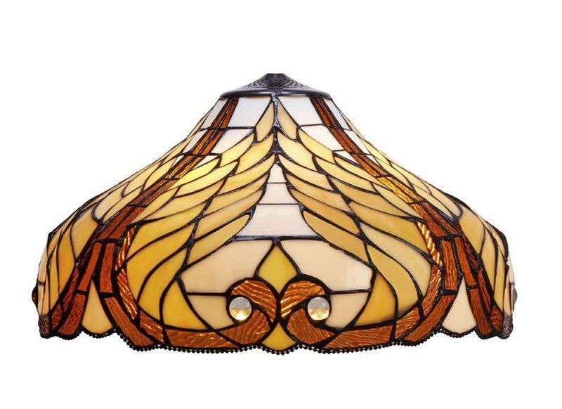 Pantalla de lámpara Tiffany Serie Dalí de 45 cm, con diseño artístico en vidrio tallado en tonos amarillos, marrones y crema. Ideal para lámparas fijas en salones, comedores o dormitorios. Estilo clásico y elegante, con acabado metálico que realza su diseño. Perfecta para crear una iluminación cálida y ambiental en espacios de decoración tradiciona