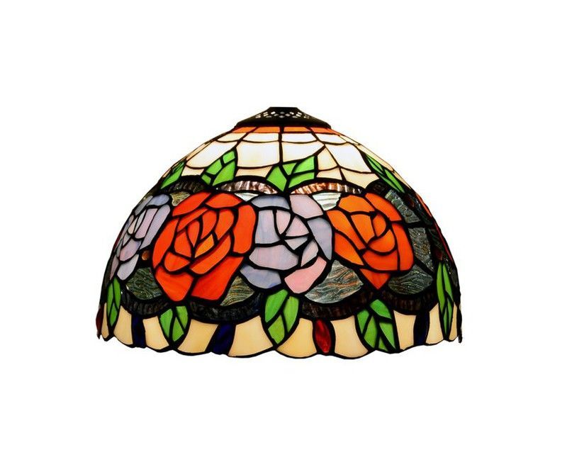 Pantalla de lámpara Tiffany Serie Rosy de 20 cm de diámetro, con diseño floral en estilo artesanal. Fabricada en vidrio de colores con motivos de rosas y hojas verdes, ideal para lámparas fijas en salones, dormitorios o espacios con estilo clásico. Aporta un toque elegante y cálido a tu hogar.