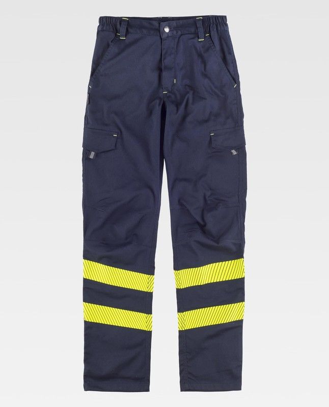 Pantalón de trabajo en color marino con detalles amarillos reflectantes, ideal para profesionales que requieren visibilidad y comodidad. Confeccionado en mezcla de poliéster y algodón, ofrece resistencia y transpirabilidad. Incluye bolsillos funcionales y cintura elástica para mayor comodidad. Perfecto para sectores de construcción, logística y man