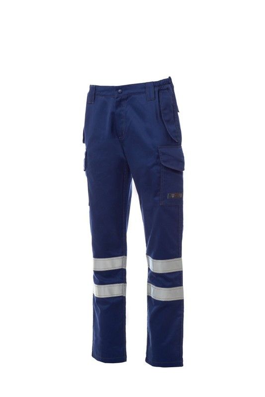 Pantalones cargo DEFENDER REFLEX 2.0 en color azul, ideales para trabajadores que necesitan visibilidad y comodidad. Confeccionados en mezcla de poliéster y algodón, ofrecen resistencia y transpirabilidad. Incluyen bandas reflectantes dobles en las piernas para mayor seguridad en entornos con baja visibilidad. Diseño funcional con múltiples bolsill