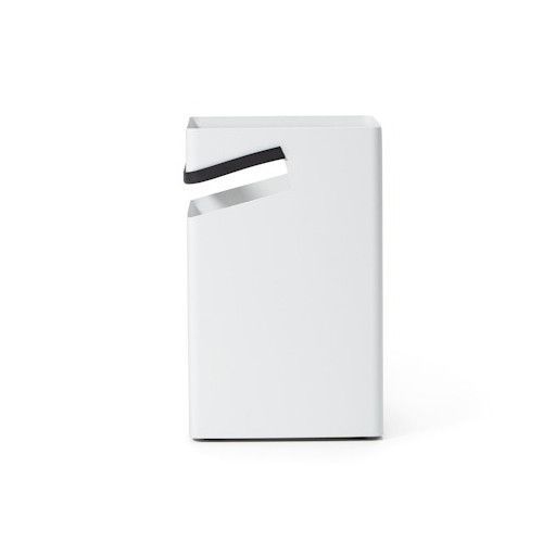 Papelera de reciclaje Lugano en color blanco con detalles negros, ideal para oficinas modernas. Diseño minimalista y funcional con abertura lateral para un uso cómodo. Fabricada en plástico resistente, perfecta para mantener espacios limpios y organizados.