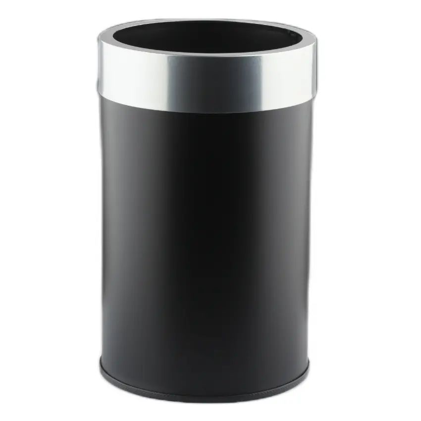 Papelera redonda de 16 litros con acabado elegante en negro mate y borde cromado brillante. Fabricada en acero inoxidable, ideal para espacios modernos como oficinas, salas o baños. Diseño minimalista y resistente, fácil de limpiar y mantener. Perfecta para mantener tu hogar o lugar de trabajo ordenado con estilo.
