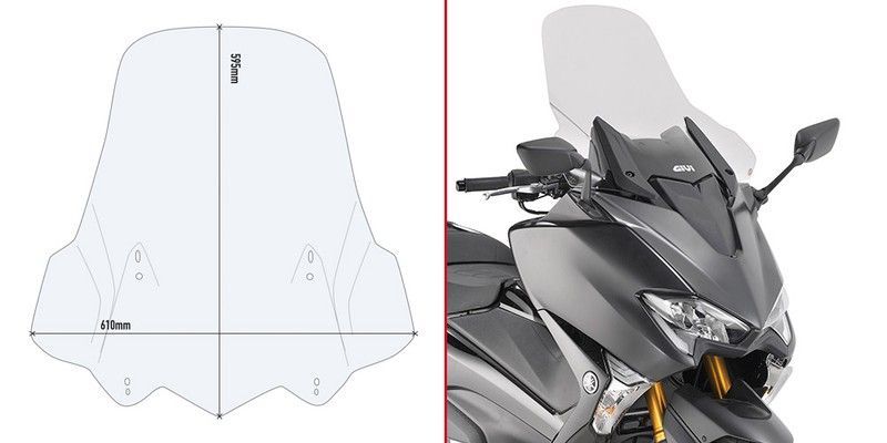 Parabrisas Givi para Yamaha T-Max 530/560 (2017-2020), fabricado en plástico resistente y transparente. Diseño aerodinámico para mayor comodidad y protección contra el viento. Ideal para motociclistas que buscan mejorar la experiencia de conducción con un accesorio de alta calidad y ajuste perfecto. Incluye puntos de montaje precisos para una insta