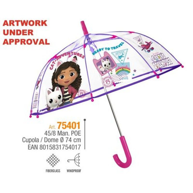 Paraguas infantil transparente con diseño divertido de una niña y gatos, ideal para niños. Con estructura de fibra de vidrio resistente y manija rosa en forma de J. Diseño con motivos de viaje, arcoíris y sellos, perfecto para proteger a los más pequeños de la lluvia con estilo. Incluye protección contra el viento y diámetro de cúpula de 74 cm.