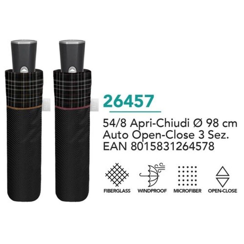Paraguas plegable Sra. modelo R-26457, ideal para adultos que buscan protección eficaz contra la lluvia. Con estructura de fibra de vidrio y tejido microfibra resistente al viento, se abre y cierra automáticamente en solo 3 segundos. Diseño elegante con estampado de cuadros en la parte superior y acabado texturizado. Perfecto para llevar en el bols