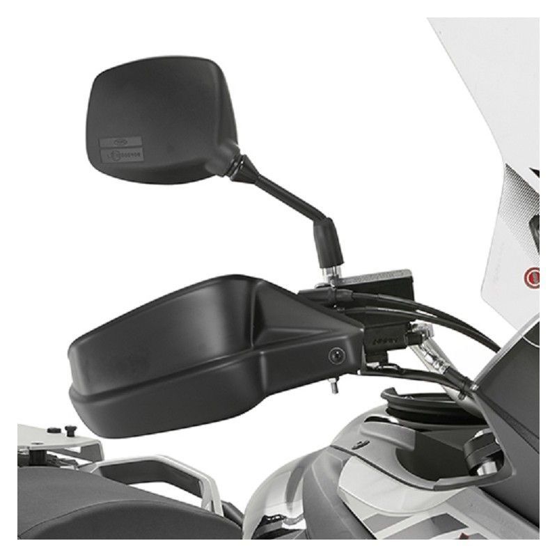 Paramanos Givi HP3112B para Suzuki DL 650 V-Strom (17-23), en color negro, fabricado en plástico resistente y metal para mayor durabilidad. Diseño ergonómico con soporte ajustable y espejo retrovisor integrado, ideal para viajes largos y mayor comodidad al conducir. Perfecto para motociclistas que buscan protección y estilo en su moto.
