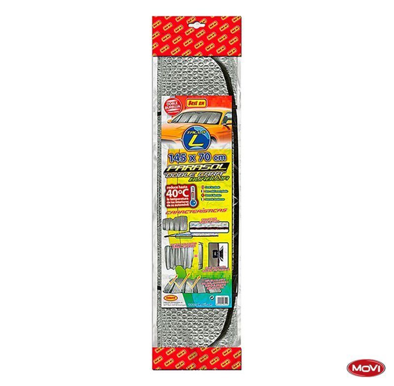 Parasol aluminizado Top 145x70 cm para coche, ideal para proteger el interior del calor solar. Con tecnología reflectante que reduce hasta 40°C, este parasol de alta calidad se instala fácilmente en el parabrisas. Diseño resistente y eficaz para conductores que buscan comodidad y protección térmica en verano. Incluye caja de cartón con detalles vis