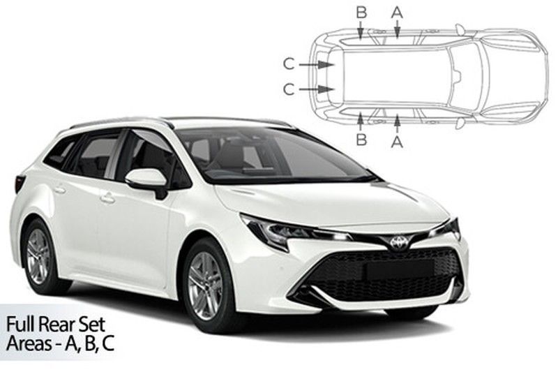 Parasoles a medida para Toyota Corolla Familiar 2018, diseñados específicamente para proteger las ventanillas traseras A, B y C. Fabricados con materiales de alta calidad para un ajuste perfecto y protección solar eficaz. Ideal para mantener el interior del coche fresco y protegido del sol. Instalación sencilla y sin dañar la carrocería. Solución p