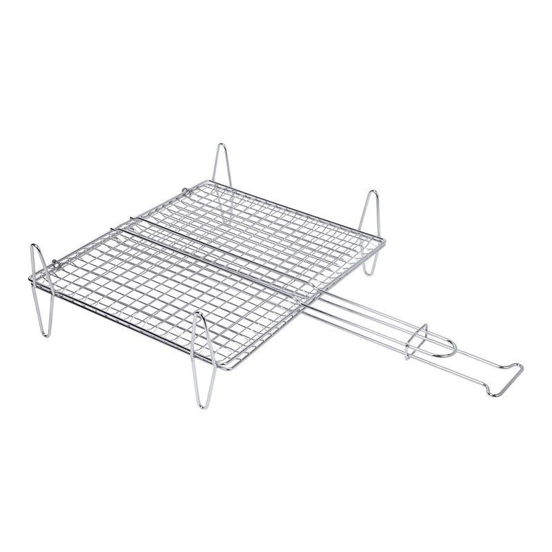 Parrilla doble para pescado Sauvic de 30x35 cm, fabricada en acero inoxidable resistente al calor y a la corrosión. Ideal para barbacoas, permite cocinar pescado y otros alimentos de forma uniforme y sin que se peguen. Su diseño con soportes elevados y mango largo facilita el manejo seguro. Perfecta para amantes de la cocina al aire libre.