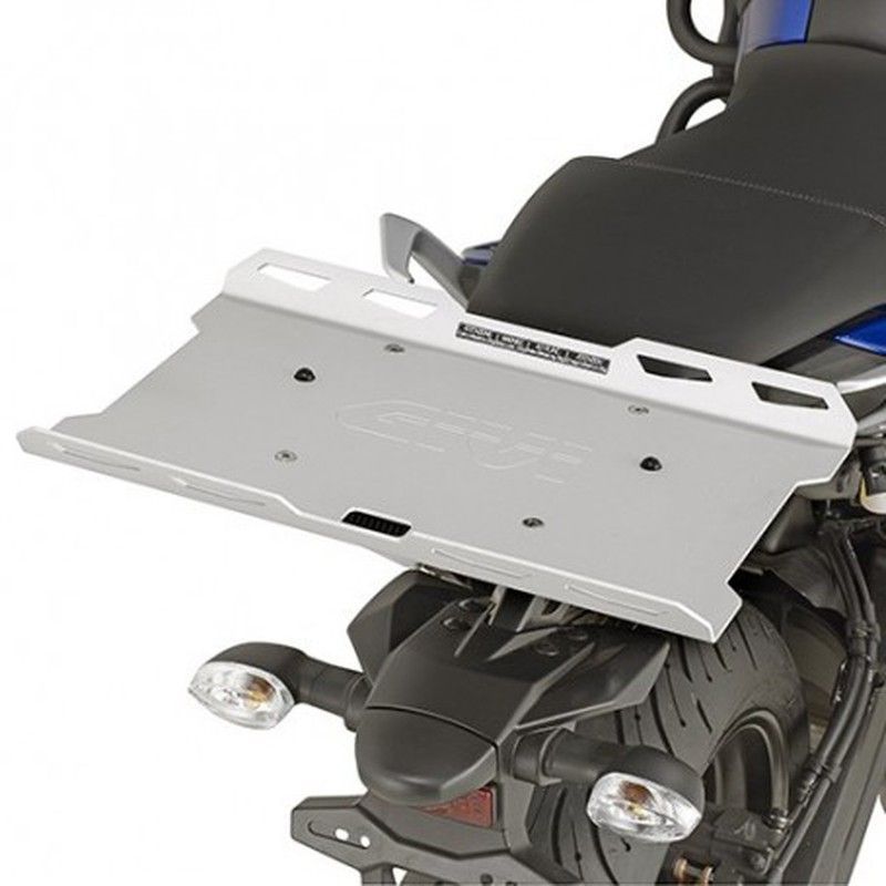 Placa rectangular de aluminio con perforaciones para montaje, logotipo givi grabado, diseño con bordes reforzados y ranuras para fijación, instalada sobre la parte trasera de una motocicleta