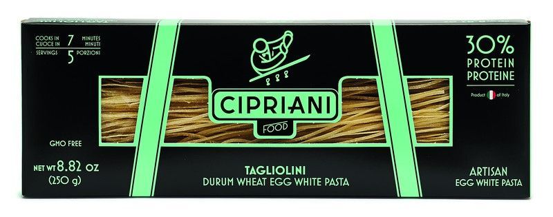 Pasta Cipriani Tagliolini con 30% de proteína, elaborada con trigo durum y huevo, ideal para quienes buscan una opción nutritiva y sabrosa. Envasada en caja rectangular con diseño verde y negro, perfecta para cocinar platos gourmet con textura auténtica. Sin OGM, ideal para dietas conscientes y amantes de la pasta de calidad.
