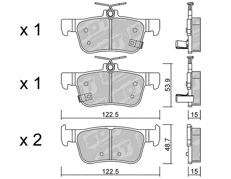 Pastillas de freno SDT FDHP 1050 21103800, diseñadas para vehículos motorizados. Fabricadas con compuesto cerámico de alta resistencia y componentes metálicos para una frenada precisa y duradera. Incluyen dos juegos de pastillas con dimensiones técnicas precisas (122.5 mm x 53.9 mm y 48.7 mm) y grosor de 15 mm. Ideales para mejorar la seguridad y r