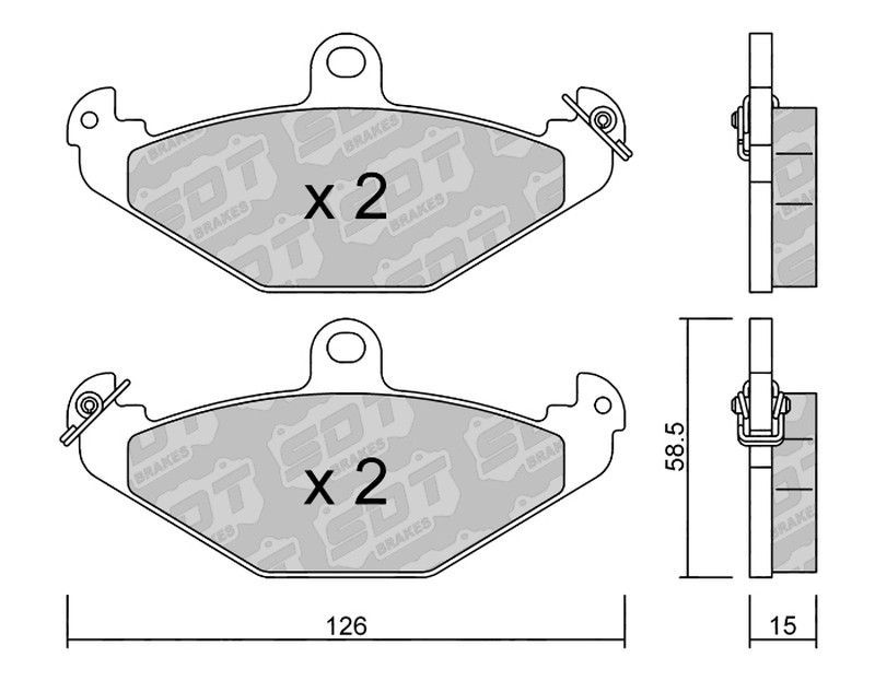 Pastillas de freno SDT FDHP 1050 2164500, diseñadas para vehículos motorizados. Fabricadas con compuesto de fricción de alta resistencia y estructura metálica para una durabilidad óptima. Ideales para mejorar la eficacia del sistema de frenado en motocicletas y vehículos similares. Incluyen 4 pastillas (2 pares) con dimensiones precisas: 126 mm de
