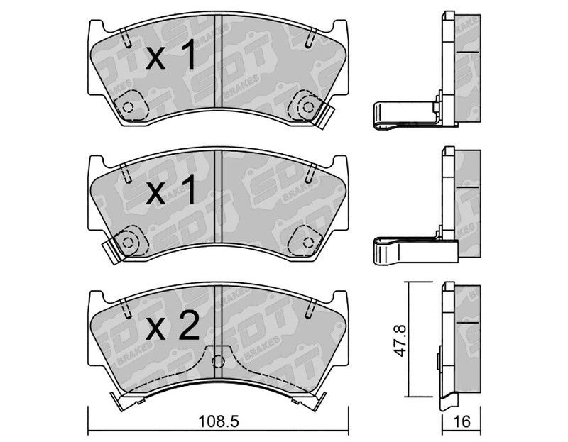Pastillas de freno SDT FDHP 1050 2171200, fabricadas con materiales de alta resistencia como cerámica y metal, ideales para vehículos motorizados que requieren un rendimiento óptimo y durabilidad. Diseño con ranuras de ventilación para una mejor disipación del calor y mayor eficiencia en frenado. Incluye dimensiones precisas (108.5 mm x 47.8 mm) y