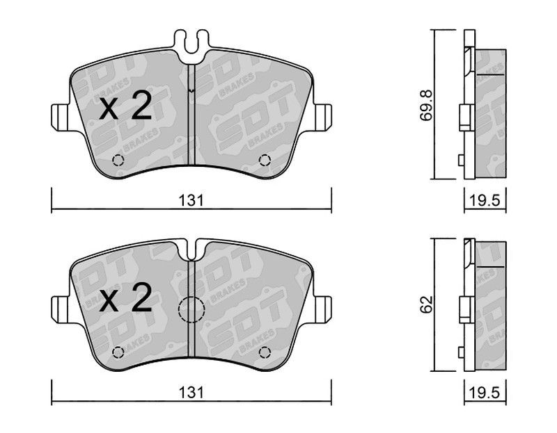 Pastillas de freno SDT FDHP 1050 2187800, diseñadas para vehículos motorizados. Fabricadas con materiales de alta resistencia como cerámica y metal, ofrecen una excelente eficacia de frenado y durabilidad. Incluyen dos pares de pastillas con dimensiones precisas (131 mm de ancho, alturas de 69.8 mm y 62 mm) para un ajuste perfecto. Ideal para condu