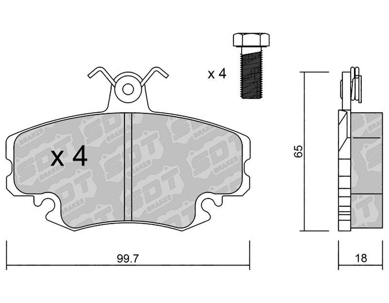 Pastillas de freno SDT RT1066 2533801RT, diseñadas para vehículos motorizados con alto rendimiento. Fabricadas con compuesto de fricción resistente y montaje metálico robusto. Incluyen 4 pastillas y 4 tornillos de fijación. Dimensiones precisas: 99,7 mm de ancho, 65 mm de altura y 18 mm de grosor. Ideal para mejorar la eficacia del sistema de frena